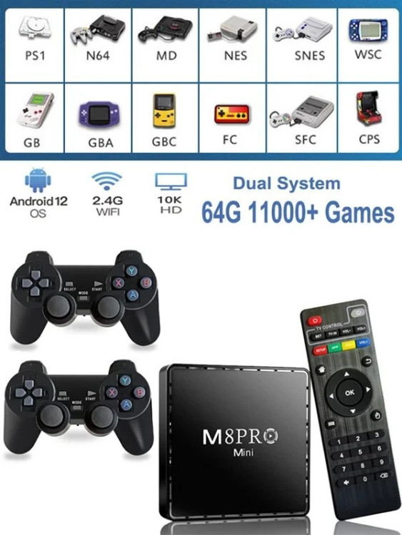 اندروید باکس فوق العاده M8 pro mini با 64 گیگ از بازی های نوستالژی و دو دسته بازی بلوتوثی ، به کمک این دستگاه علاوه بر مشاهده و استفاده از تمامی نرم افزار های نمایش فیلم همچون فیلیمو ، نماوا ،فیلم نت و ... و امکان مشاهده کانال های IPTV امکان بازی نیز فراهم است . این دستگاه دارای اندروید 12 ، 2 گیگ رم و 16 گیگ حافظه داخلی میباشد و قادر است فیلم های 4k را نیز پخش نماید ، قابلیت اتصال بصورت wifi و کابل شبکه وجود دارد .
