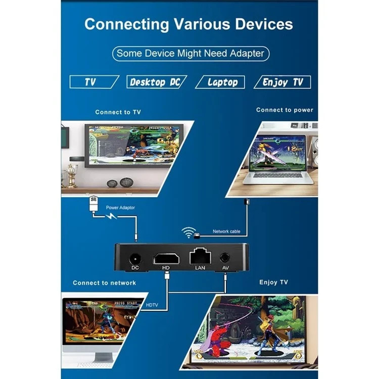 نحوه راه اندازی: نحوه اتصال: فقط کنسول بازی را به رابط تلویزیون وصل کنید، کابل داده منبع تغذیه USB را به کنسول وصل کنید، تلویزیون را تنظیم کنید منبع به کانال با کیفیت بالا مربوطه متصل کنید، و لیست بازی بر روی صفحه نمایش روی تلویزیون نمایش داده خواهد شد