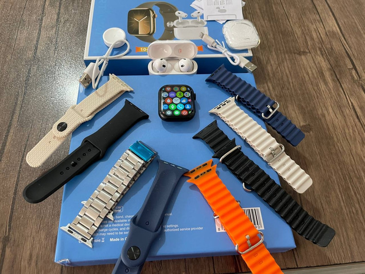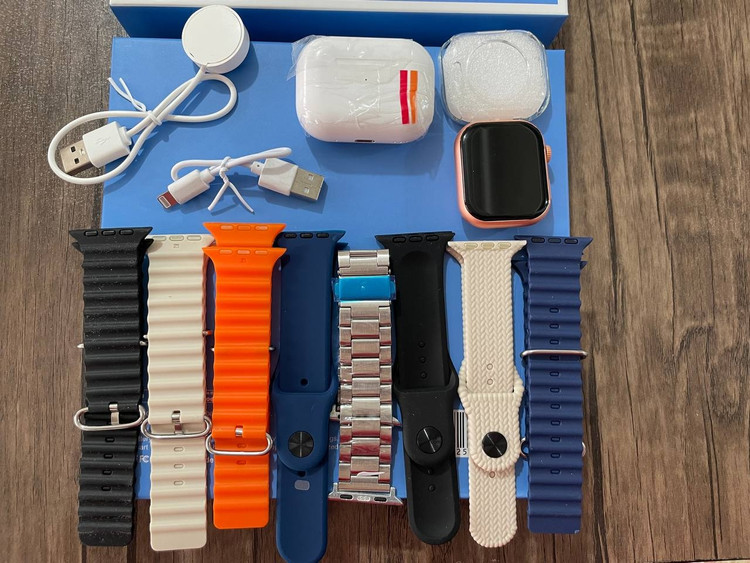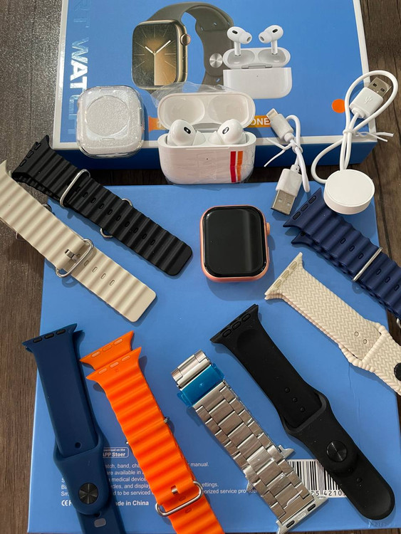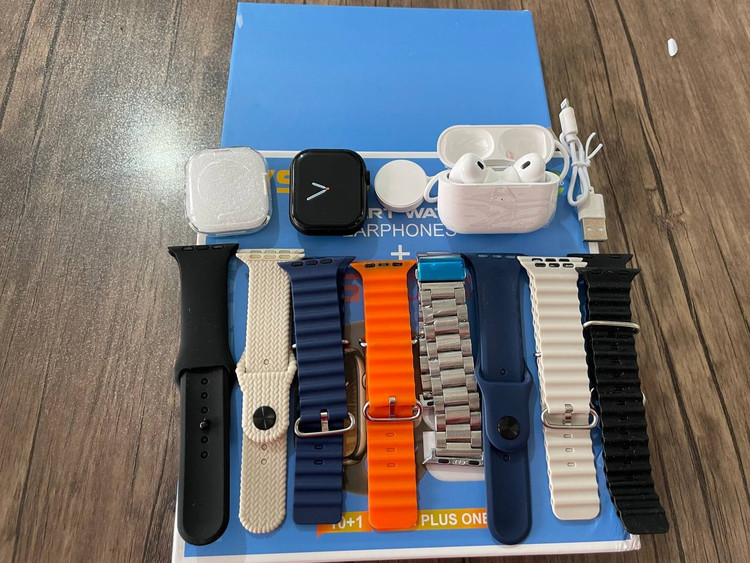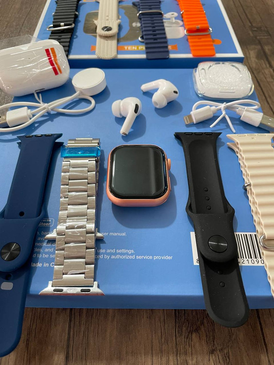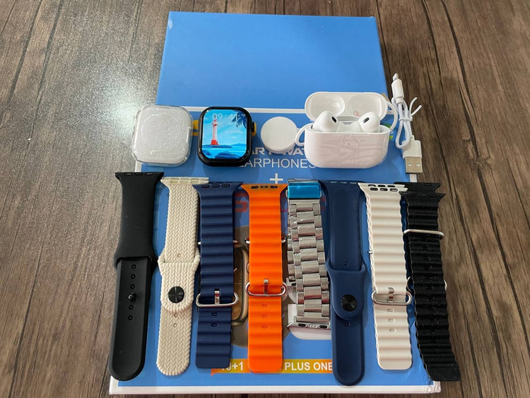 این مدل ساعت در واقع یک پک کامل اقتصادی برای استفاده کاربران عزیز است که شامل یک ساعت سری 8 الترا بسیار با کیفیت ، یک عدد ایرپاد و 8 عدد بند اپلی در طرح ها و رنگهای مختلف است .