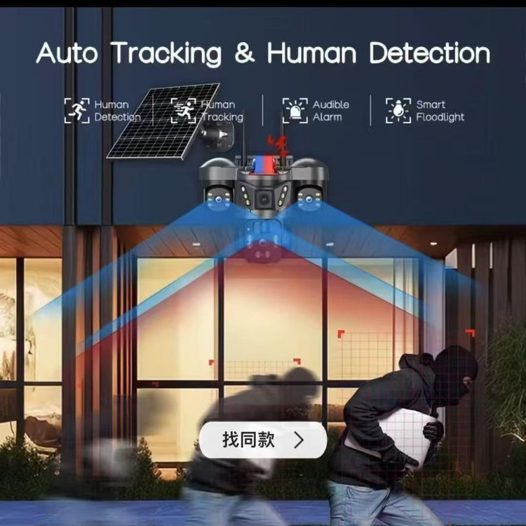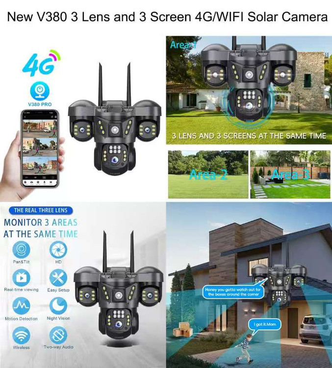 دوربین مداربسته خورشیدی v380 مدل X3 اصلی(چرخش، شیب و زوم) را نشان میدهد که معمولاً برای نظارت بر فضای باز استفاده میشود. این دوربینها دارای پنل خورشیدی برای تامین انرژی هستند و میتوانند از راه دور کنترل شوند