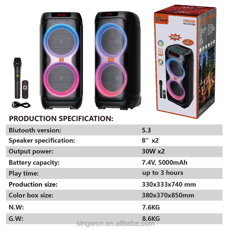با اسپیکر و پارتی باکس قدرتمند و قابل حملZQS 8280 می توانید مهمانی را با صدای قدرتمند و نمایش نور پویا و تمام عیار شروع کنید. این دستگاه ، با صدای قدرتمند و باس عمیق همراه با ولوم اکو و دیلی ، برای هر مهمانی، محتوای جدیدی به ارمغان می آورد. همچنین مجموعه ای از فن آوری های پیشرفته مانند بلوتوث را در خود دارد. استفاده از میکروفون اسپیکر جهت آواز. پشتیبانی USB، AUX، رادیو ، HD Sounds ، تکنولوژی میک پری و... از جذابیت های دیگر این اسپیکر می باشد.